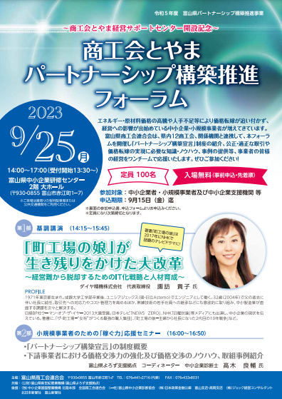 【9/15(金)締切】参加無料!【県商工会連合会】令和5年度「商工会とやまパートナーシップ構築推進フォーラム」の開催について