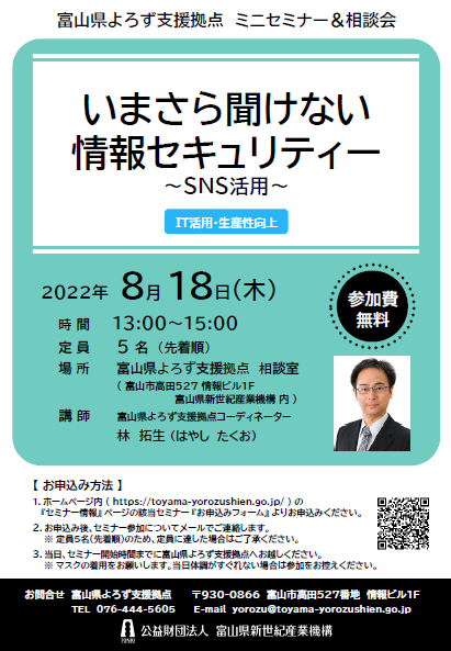 | 日時・場所 | 令和4年8月18日(木) 13:00 ~ 15:00 富山県新世紀産業機構 情報ビル1F 相談室 |