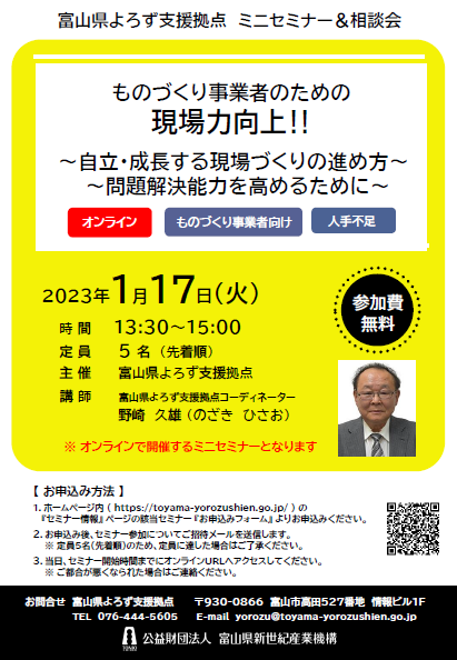 | セミナー内容 | ・テーマ 「ものづくり事業者のための現場力向上 !! 」 チラシ ~自立・成長する現場づくりの進め方~ ~問題解決能力を高めるために~ ・相談会(質疑応答) |