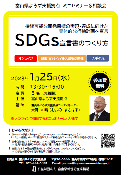 ミニセミナーでは、企業価値の向上を目的とし、適切な「SDGs宣言書」を作成するための考え方や作成方法についてお話します。