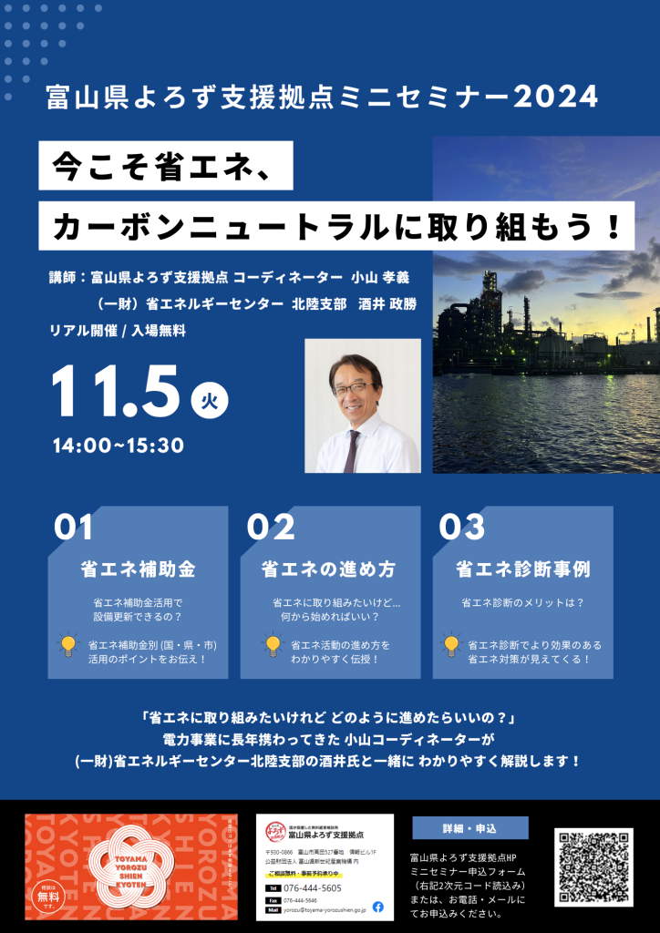 | 開催内容 | 令和6年11月5日(火)14:00~15:30 『今こそ省エネ、カーボンニュートラルに取り組もう!』 ・省エネに関する補助金(富山県よろず支援拠点 小山 孝義コーディネーター) ・省エネの進め方と省エネ診断事例( (一財)省エネルギーセンター 北陸支部 酒井 政勝) |