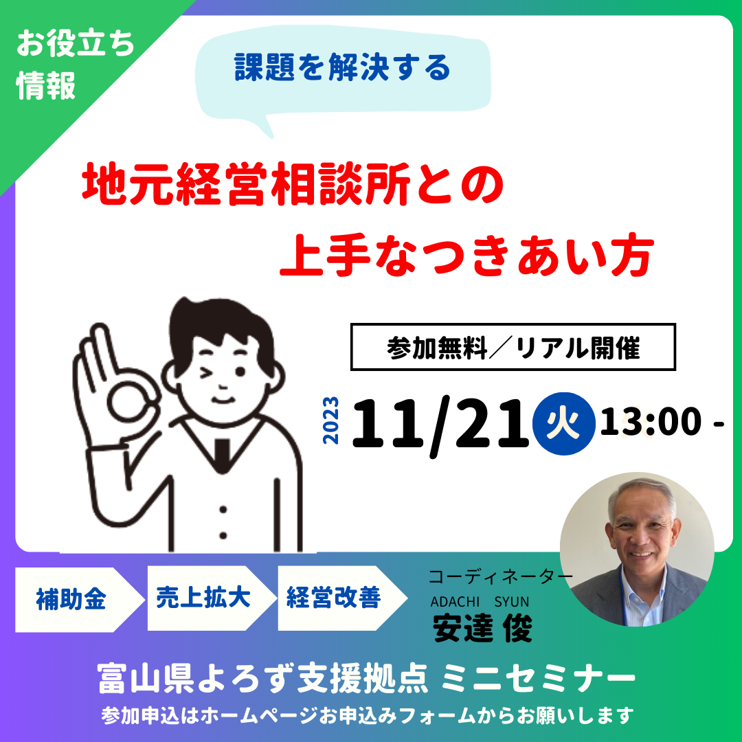 | 日時・場所 | 令和5年11月21日(火) 13:00 ~ 14:30 富山県新世紀産業機構 情報ビル1F 富山県よろず支援拠点 |