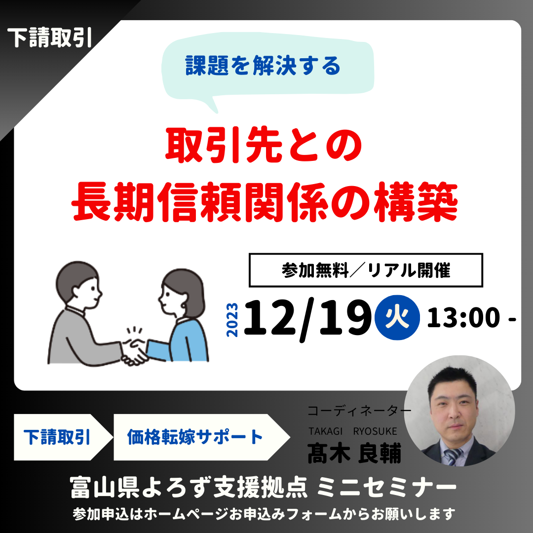 | 日時・場所 | 令和5年12月19日(火) 13:00 ~ 14:30 富山県新世紀産業機構 情報ビル1F 富山県よろず支援拠点 |