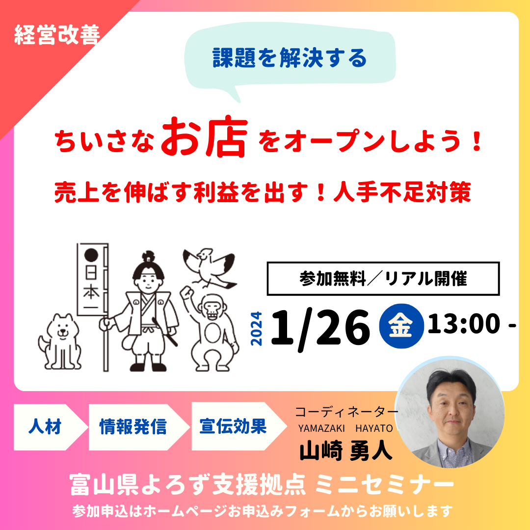 | 日時・場所 | 令和6年1月26日(金) 13:00 ~ 14:30 富山県新世紀産業機構 情報ビル1F 富山県よろず支援拠点 |