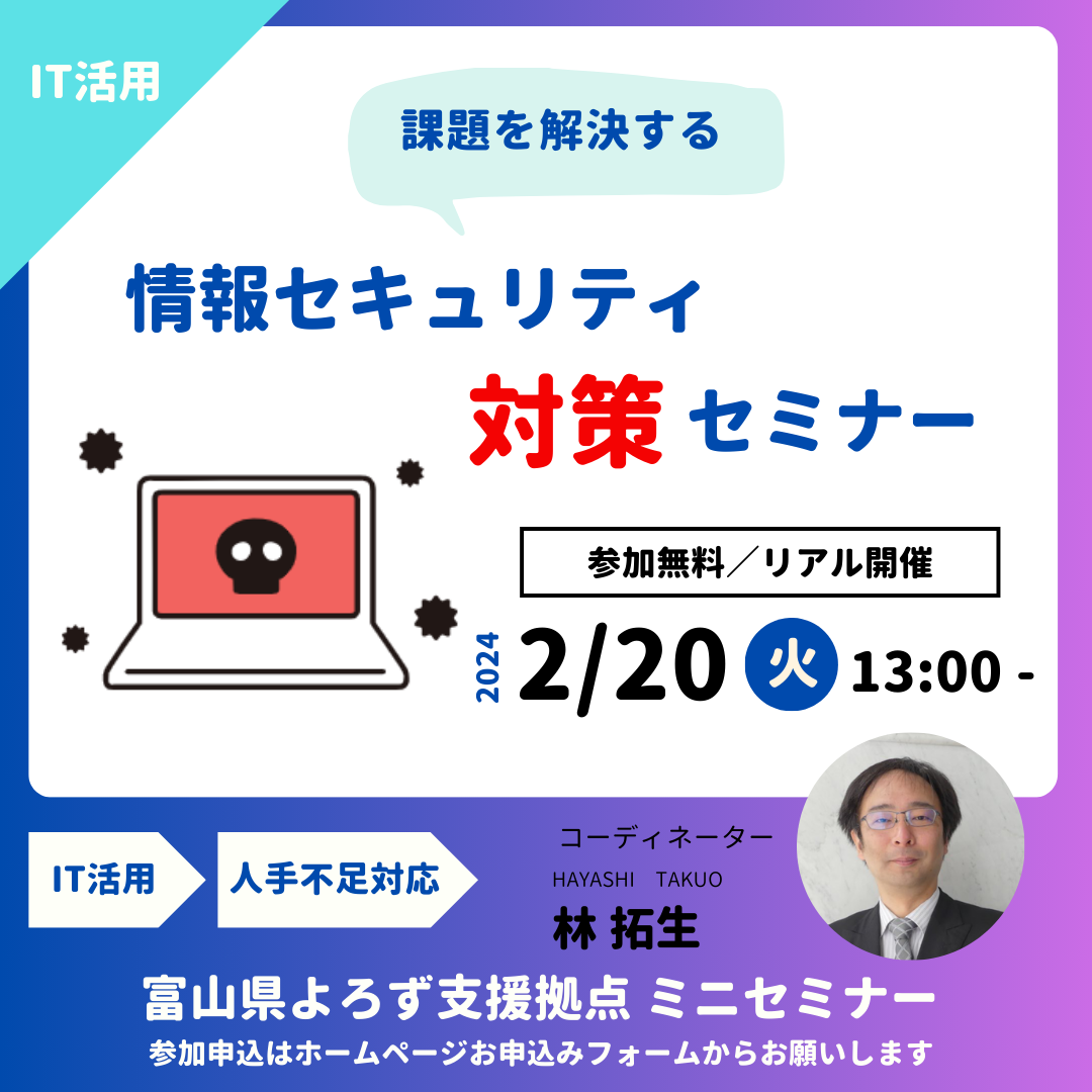| セミナー内容 | ・テーマ 「情報セキュリティ対策セミナー」 チラシ ・質疑応答 |