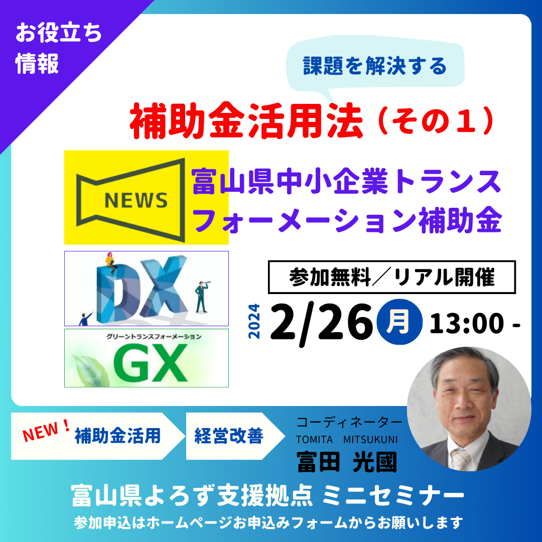 令和6年の新しい補助金「富山県中小企業トランスフォーメーション補助金」について説明します。
